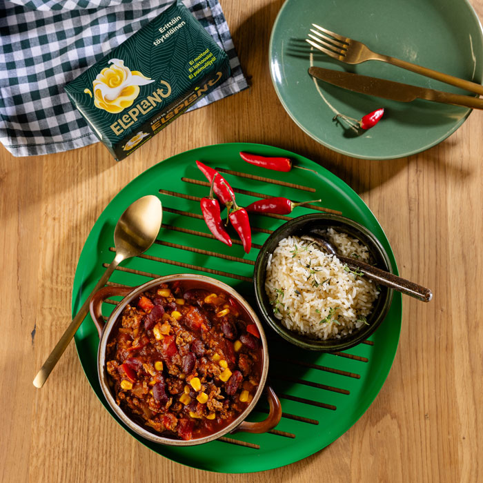 Chili con carne on helppo ja nopeasti valmistuva arkiruoka, joka hurmaa mausteisella maullaan. Tarjoa lempeän tulisen kastikkeen kanssa sitruunalla maustettua paistettua riisiä, joka syntyy helposti keitetystä riisistä. Chili con carne reseptimme on helposti muokattavissa vegaaniseksi: korvaa jauheliha esimerkiksi soijarouheella, jolloin siitä tulee chili sin carne. Viimeistele annos lusikallisella creme fraichea tai vegaanista vaihtoehtoa, joka täydentää kastikkeen makumaailmaa ja tuo annokseen pehmeyttä.