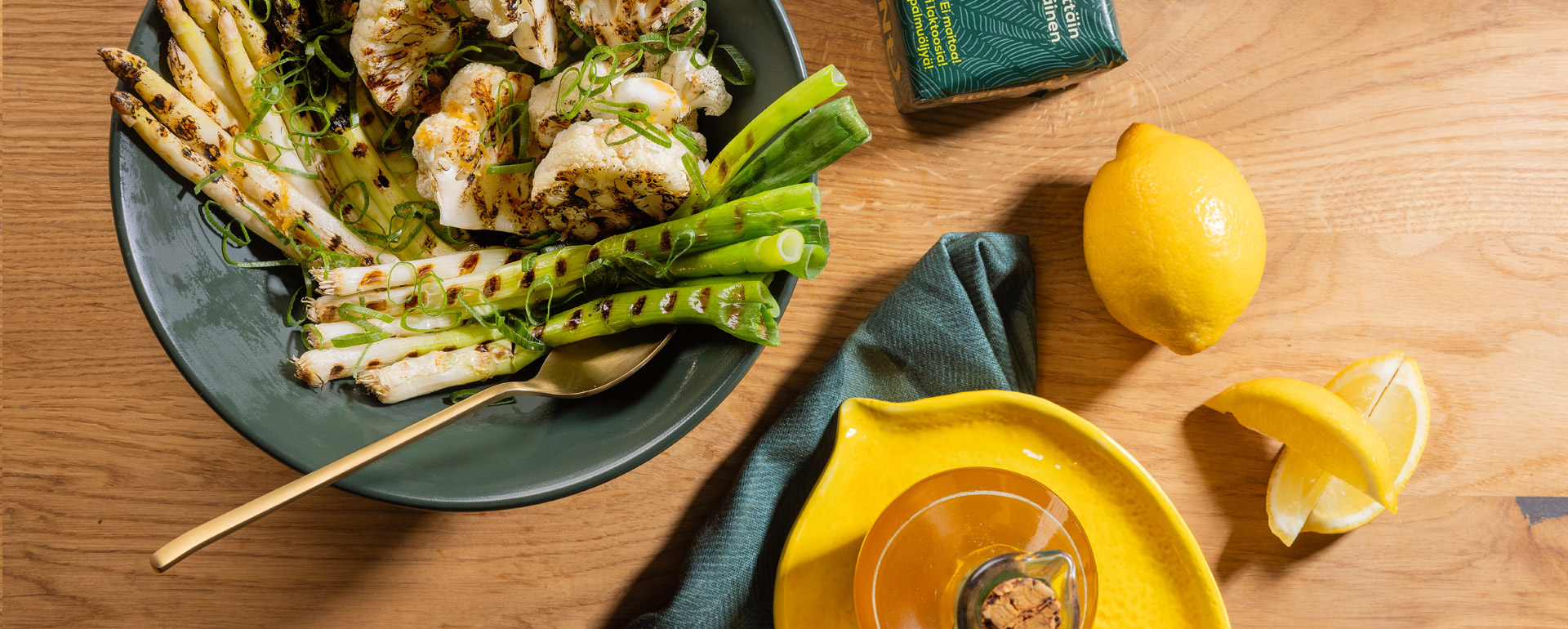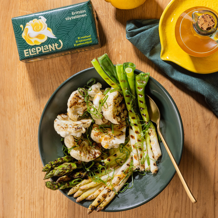 Grillatut kasvikset valmistuvat nopeasti grillissä. Voit käyttää myös muita sesongin kasviksia, esimerkiksi hunajanaurista tai kyssäkaalia. Ruskistettu Eleplant-vinegretti sopii kasvisten lisäksi myös kalalle tai lihalle.
