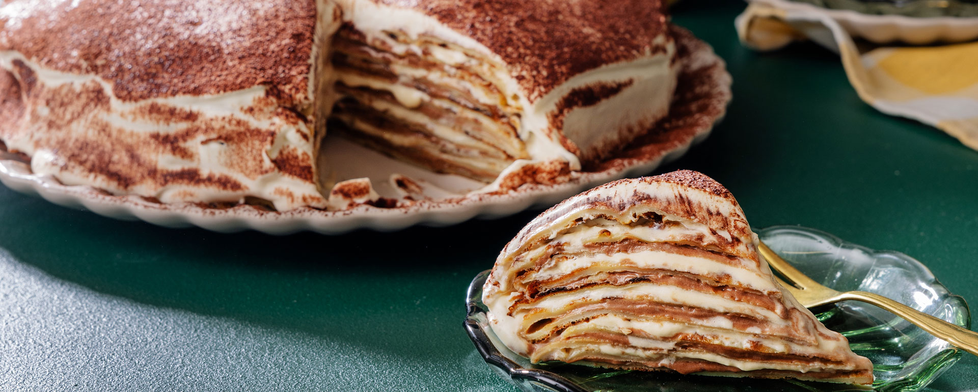 Mille crepe on ranskalainen klassikkoleivonnainen, jossa ohuiden lettujen väliin ladotaan kerros kerrokselta herkullista täytettä. Tässä versiossa lettukakku saa makua täyteläisestä kahvikreemistä ja samettisesta Nutella-tuorejuustotäytteestä, jotka tekevät siitä vastustamattoman yhdistelmän. Ohuiden lettujen ansiosta tämä ranskalainen kakku on rakenteeltaan hienostunut mutta helppo valmistaa. Pinta koristellaan ilmavalla kermavaahdolla ja kaakaojauheella, ja lopputulos on näyttävä kahvijälkiruoka vaikka juhlapöytään tai viikonlopun herkutteluhetkiin.