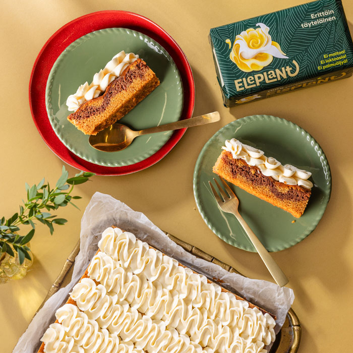 Korvapuustikakku on ihastuttava leivonnainen, jossa korvapuustin mausteet pääsevät oikeuksiinsa mehevän kakun muodossa. Kardemumman, kanelin ja fariinisokerin yhdistelmä tuo leivonnaiseen lämmintä nostalgiaa, ja pehmeä Eleplant-kuorrute kruunaa kokonaisuuden. Tämä gluteeniton herkku sopii niin juhlapöytään kuin arjen makeisiin hetkiin!