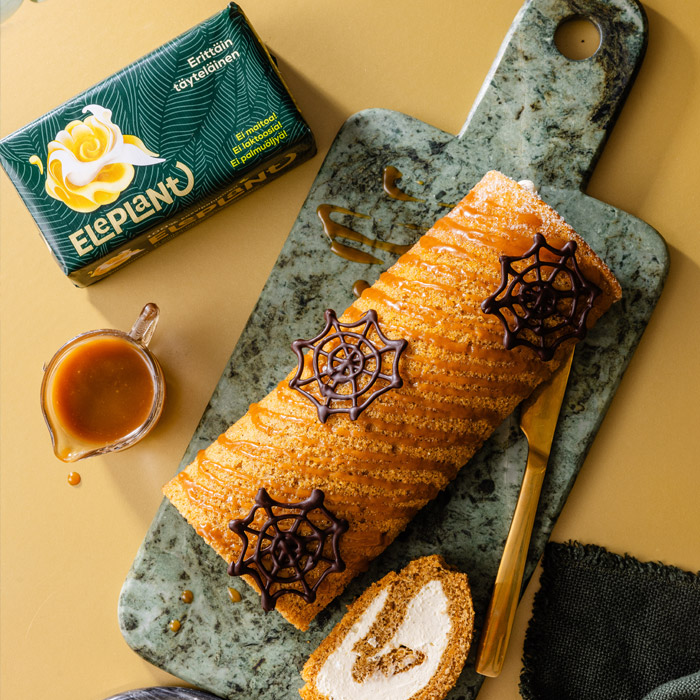 Valuta kinuskia kääretortun pinnalle tai tarjoile se erikseen. Koristele lopuksi valmis kurpitsakääretorttu haluamillasi koristeilla.