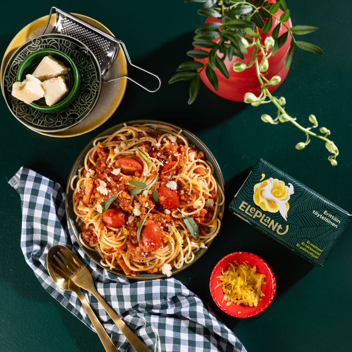 Tarjoile linssibolognese sitruunavoispagetin kera ja lisää halutessasi annokseen vegaanista tai tavallista parmesan-juustoa ja tuoreita yrttejä.