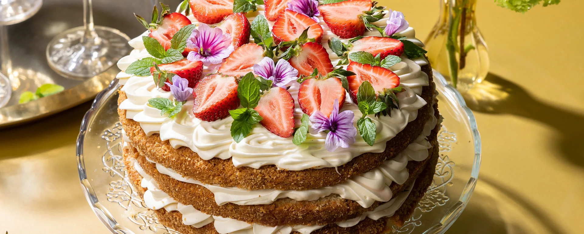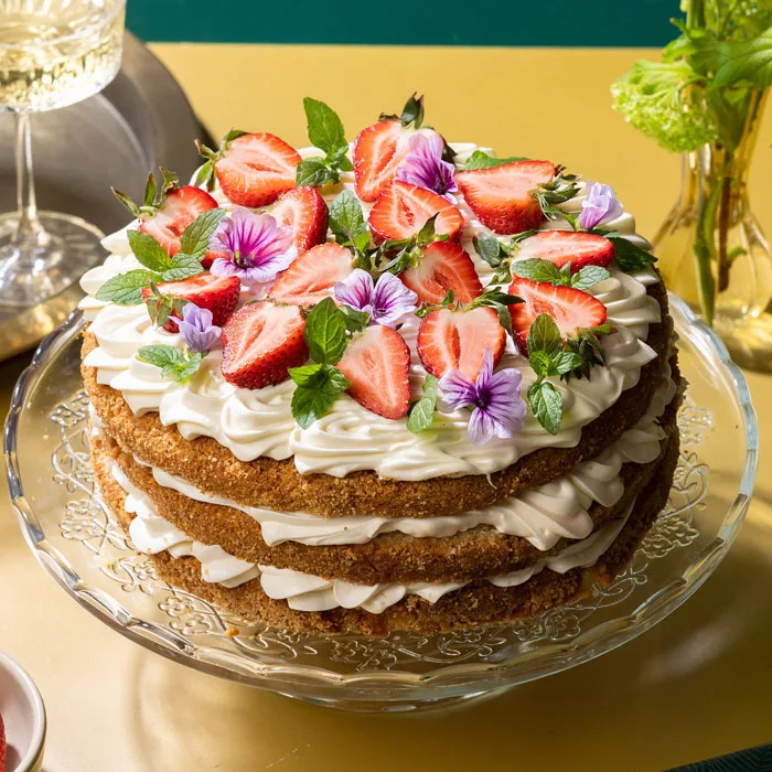 14. Toista kerrokset ja koristele pinta mansikoilla, mintulla ja syötävillä kukilla.