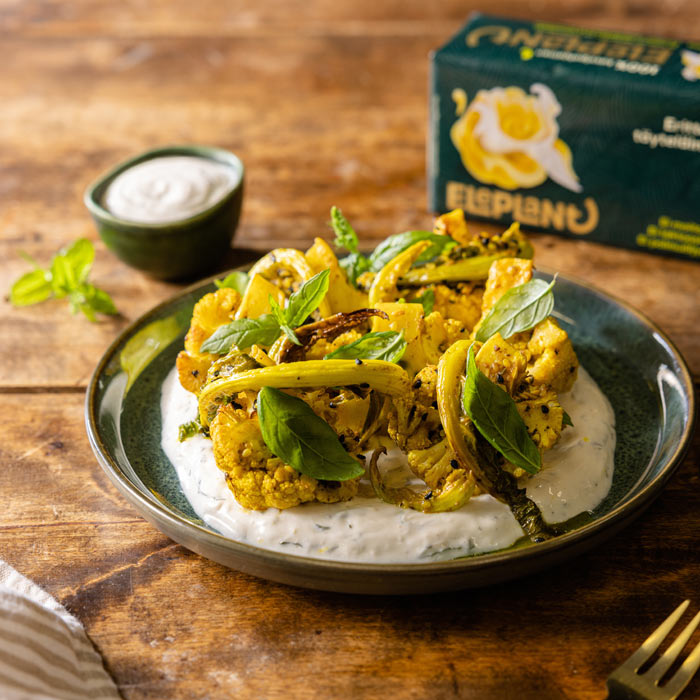 Mausteinen paahdettu kukkakaali sekä minttujugurttikastike sopivat lisukkeeksi esimerkiksi näissä resepteissä, kirjolohta ja puikulaperunaa sekä kirjolohta en papillote.