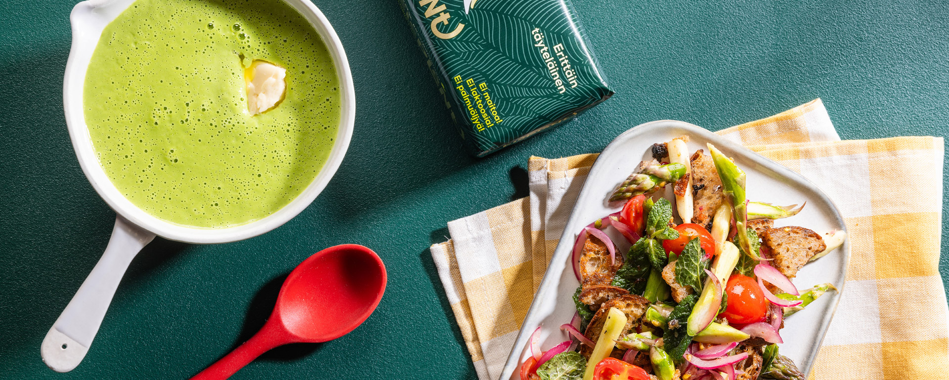 Kauniin vihreä ja kermainen parsakeitto valmistuu kätevästi parsan kannoista, jolloin raaka-aine hyödynnetään viimeistä vartta myöten. Silkinsileä keitto on kevyt mutta täyteläinen vaihtoehto, joka hurmaa niin arjessa kuin juhlassakin. Sen rinnalla italialainen panzanella-salaatti tuo pöytään raikasta kontrastia: makeat tomaatit, rapeat krutongit ja parsan nuput muodostavat leipäsalaatin, jossa yhdistyvät kesän maut ja rennon rustiikkinen eleganssi. Yhdessä nämä reseptit tekevät kokonaisuudesta runsaan ja viehättävän aterian, joka ilahduttaa jokaista ruokailijaa.