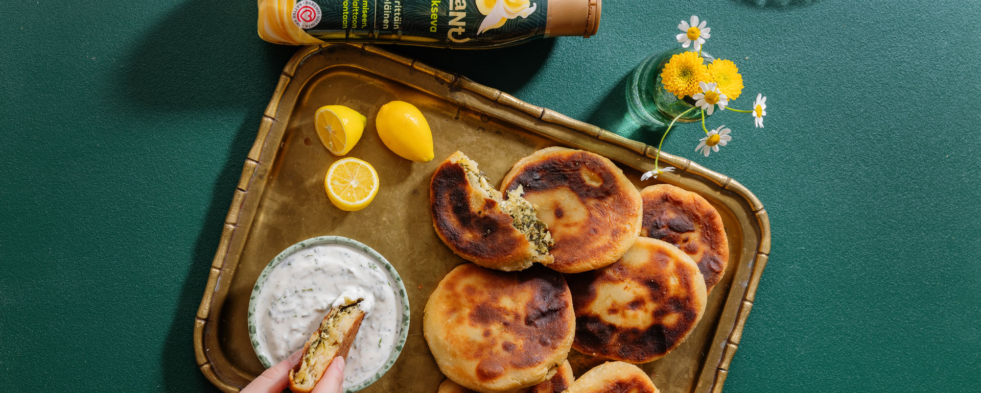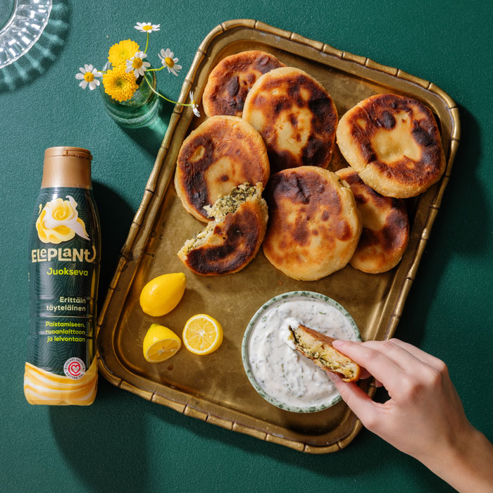 Flatbread eli pannuleipä on mainio vaihtoehto suolaiseksi tarjottavaksi juhliin, illanistujaisiin tai viikonlopun herkkuhetkiin. Pannulla paistettavat leivät täytetään pinaatilla, fetalla, paahdetuilla siemenillä ja tuoreella mintulla – makuyhdistelmä on täyteläinen mutta samalla raikas. Jogurttitaikinasta valmistettu taikina pysyy mehevänä ja pehmeänä paistettaessa. Kylkeen sopii raikas jogurttidippi, joka viimeistelee kokonaisuuden ja tuo leiville ihanaa tasapainoa. Sulkemisesta löytyy vinkkivideoita netistä.