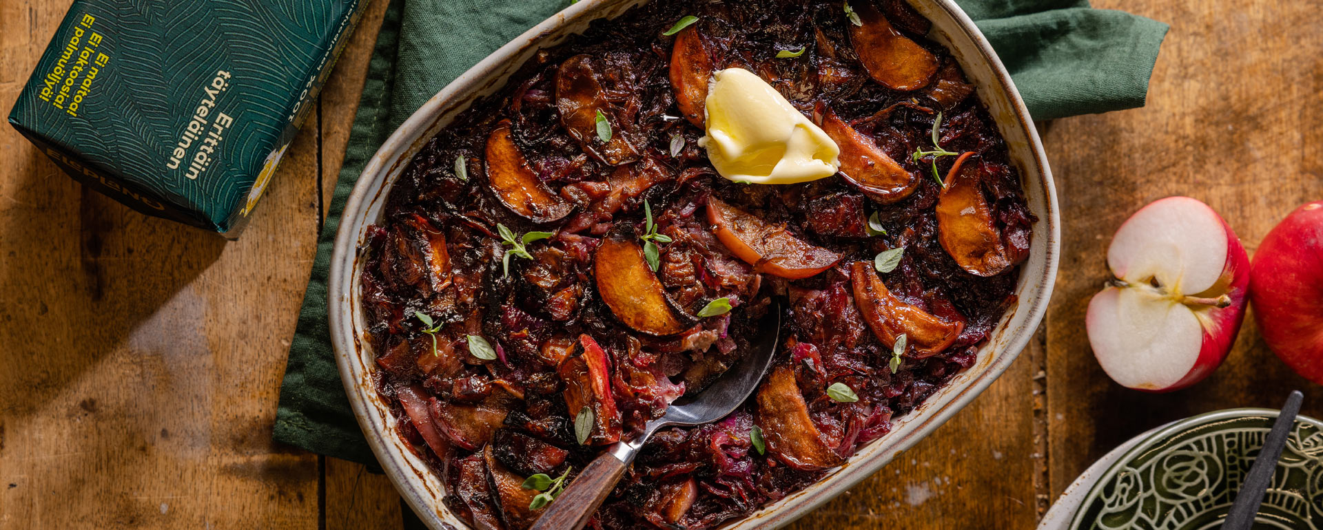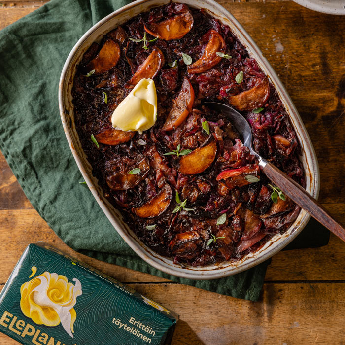 Eleplantin punakaalilaatikko sopii jo värinsäkin puolesta perinteiseen joulupöytään, mausta puhumattakaan. Tämä herkullinen laatikkoruoka sopii erinomaisesti muiden joululaatikoiden rinnalle, mutta mikäli laatikoita on jo riittävästi, punakaalista voi valmistaa maukkaan kaalisalaatin tai haudutettua punakaalia. Fermentoituna se tarjoaa lisäksi hyödyllisiä maitohappobakteereita, jotka tukevat vatsan hyvinvointia. Muista kuitenkin valmistaa fermentoitu kaali jo vähintään kaksi viikkoa ennen joulua!