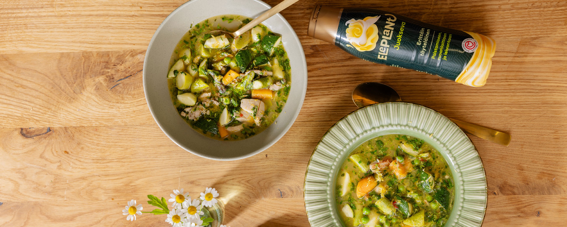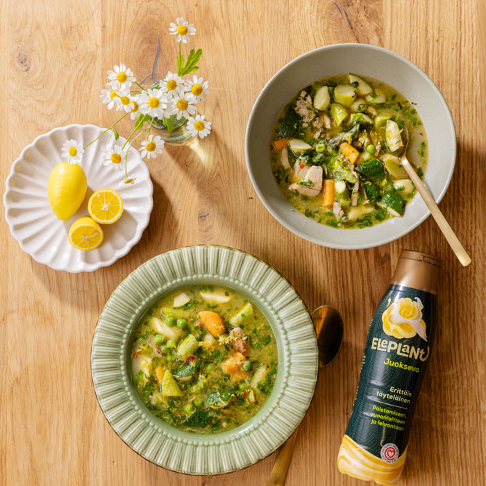 Sitruunainen kanakeitto on raikkaan kevyt ja maukas keitto, joka tuo vaihtelua arkiruokapöytään. Mehevä broileri saa makua valkosipulista ja chilistä, ja tuoreet vihannekset tekevät keitosta terveellisen ja värikkään. Sitruunan mehu ja kuoriraaste taas tuovat lempeää hapokkuutta. Kevyt keitto valmistuu alle tunnissa ja sopii kiireiseenkin arkeen, kun kaipaat jotakin virkistävää, mutta täyttävää. Kesäinen keitto viimeistellään kevätsipulilla ja lehtipersiljalla. Erityisen hyvin keitto sopii tarjoiltavaksi sopivasti ruokaisuutta tuovan Eleplantin valkosipulipatongin kanssa.