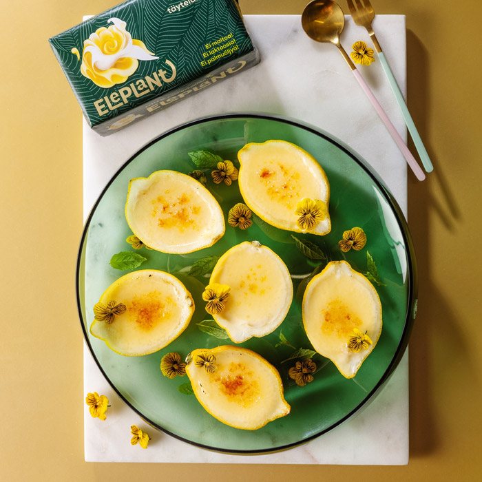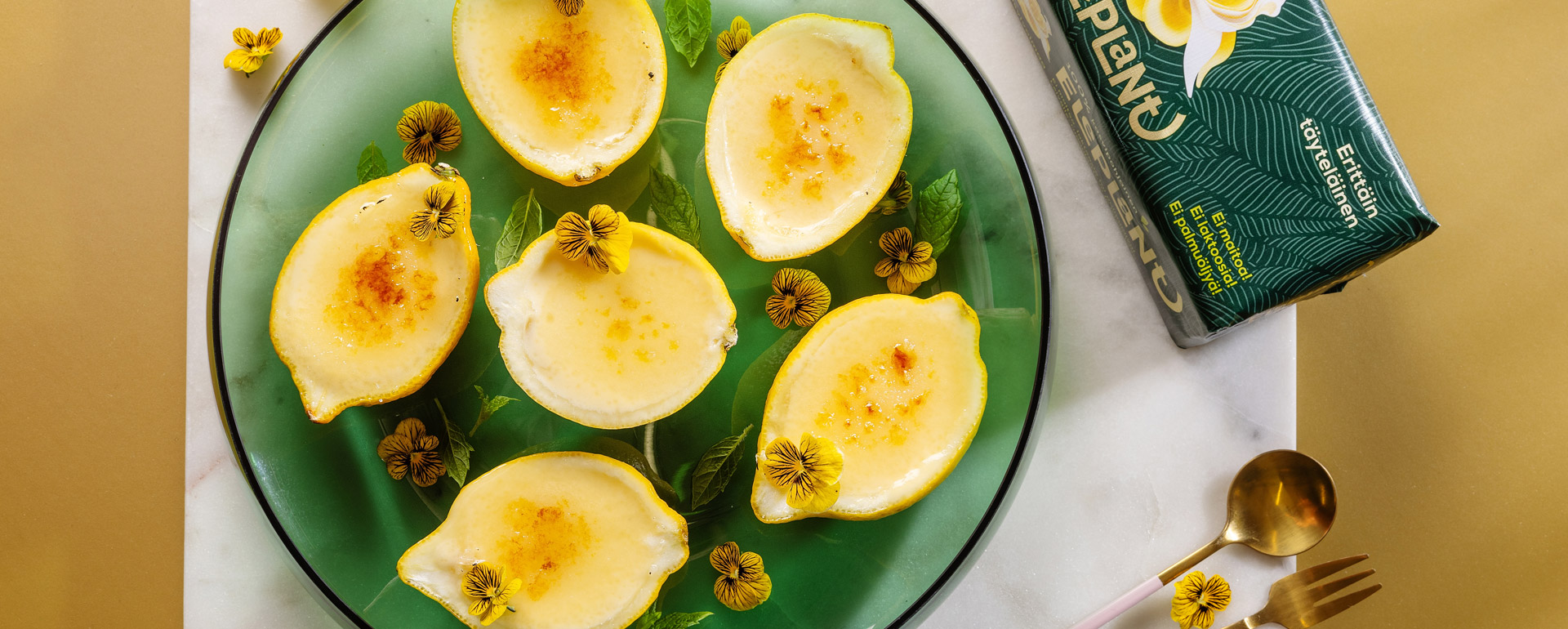 Sitruunavanukas on superhelppo ja raikas jälkiruoka. Tarjoa vanukkaat koverretuista sitruunoista ja viimeistele halutessasi rapealla sokeripinnalla.