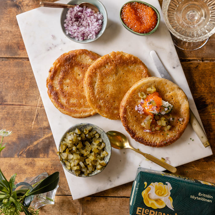 Tattariblinit ovat talvikauden suosikkeja. Tarjoile blinit mätireseptiikan kera, kuten siian, krossatun perunan ja mäti-voikastikkeen kanssa.