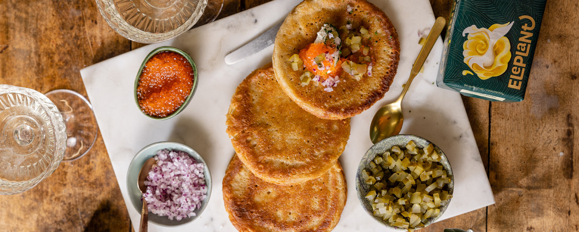 Blinit ovat talvikauden suosikkiherkkuja. Saat blineistä maidottomia korvaamalla täysmaidon kauramaidolla ja vaihtamalla smetanan esimerkiksi kaurafraicheen. (laktoositon)