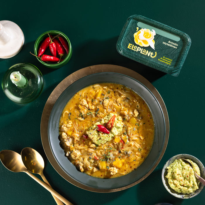 Helppo ja nopea kana-nuudelikeitto yhdistää aasialaisen maustemaailman ja suomalaisen arkiruoan vaivattomuuden. Lempeän tulinen kanakeitto valmistuu kookosmaidolla, joka tuo pehmeyttä ja täyteläistä makua. Keiton mausteet ja lämpö sopivat mainiosti viileisiin päiviin, ja avokadotahna tuo kokonaisuuteen virkistävän säväyksen. Kookoskanakeitto on täydellinen arkiruoka, joka kuitenkin poikkeaa perinteisestä suomalaisesta keitosta. Kokeile myös erilaisilla nuudeleilla, sillä kananuudelikeitto on helposti muokattavissa makusi mukaan!
