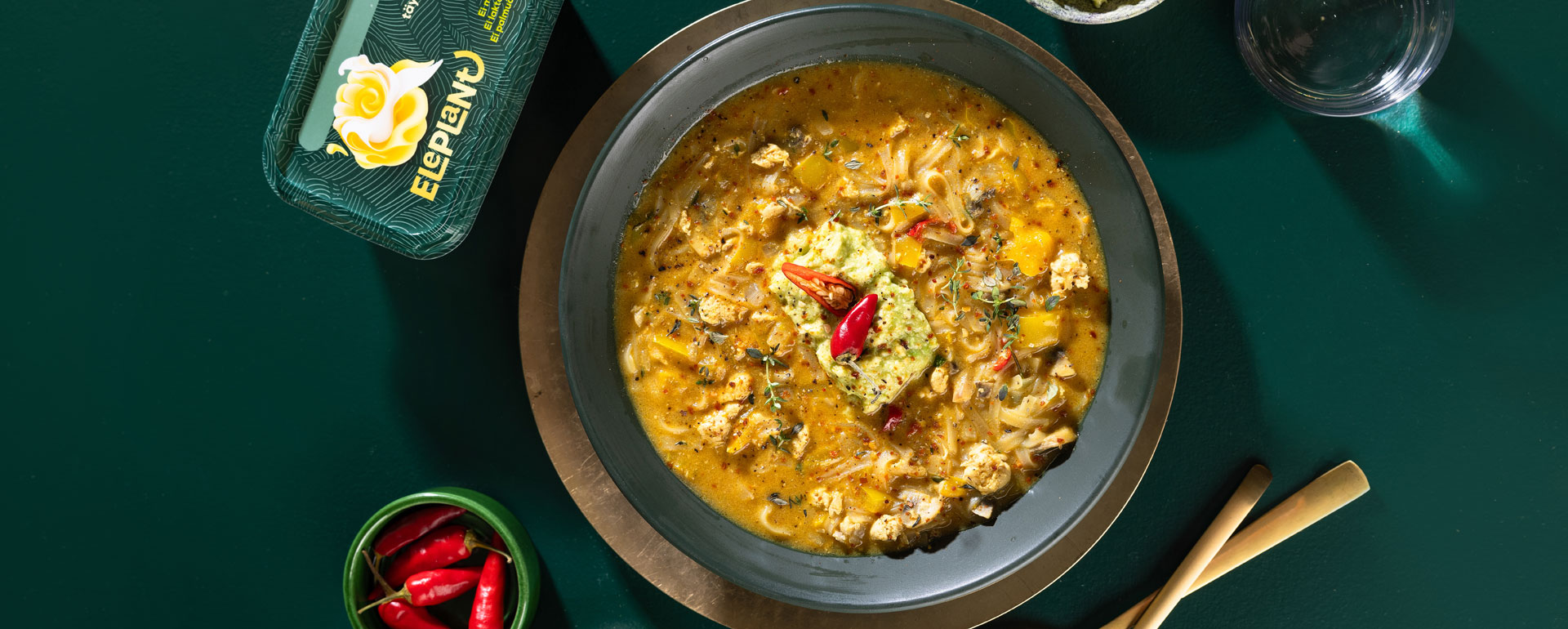 Tulinen kana-nuudelikeitto saa makua avocadotahnasta. Maista myös bataattikeittoa, johon makua antavat chili ja inkivääri.
