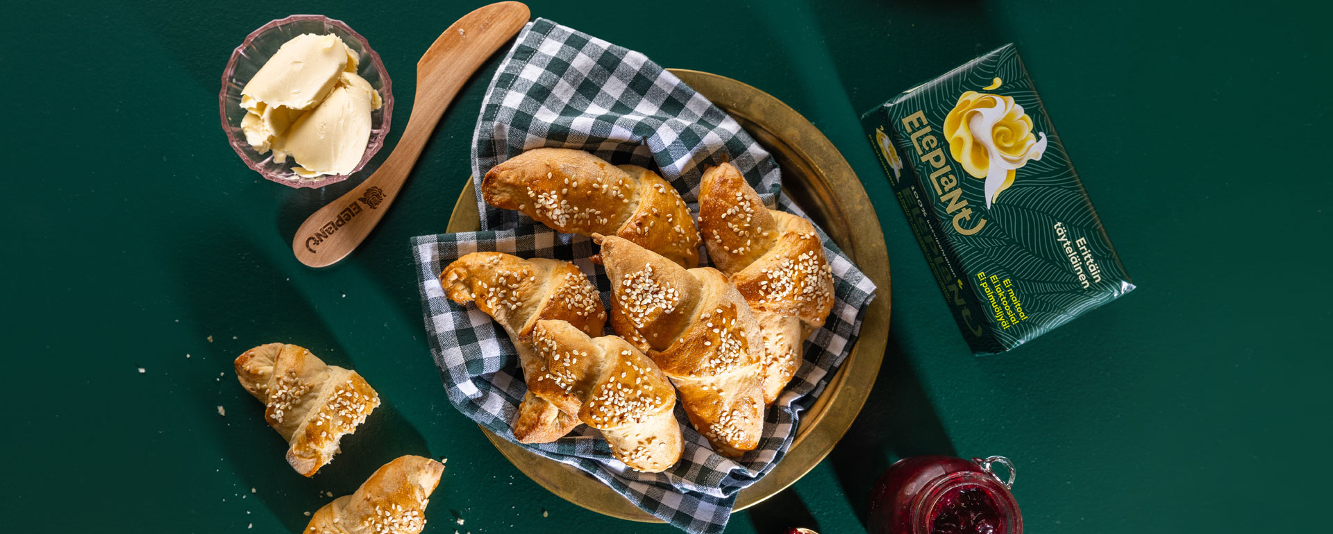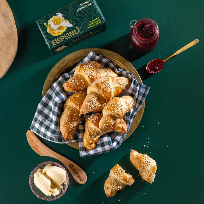 Voisarvet itseleivotusta taikinasta palkitsevat herkullisella maullaan. Pinnalle voit ripotella seesaminsiementen lisäksi muita haluamiasi siemeniä tai kuivattuja yrttejä. Voisarvet, eli croissantit, sopivat sekä suolaiseen että makeaan herkutteluun – nauti esimerkiksi hillon, marmeladin tai Eleplant-nokareen kanssa. Halutessasi voit täyttää voisarvet ennen paistoa tai paiston jälkeen, mutta huomioi, että esitäyttäminen voi vaikuttaa paistoaikaan ja lehtevyyteen.